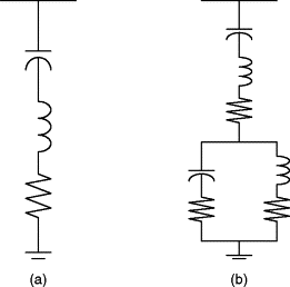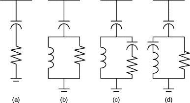 The single- and double-tuned filters are usually used to filter specific frequencies, while the damped filters are used to filter a wide range of frequencies. In applications involving small harmonic producing loads, it is often possible to use one single-tuned filter (usually tuned near the fifth harmonic) to eliminate problematic harmonic currents. In large applications, like those associated with arc furnaces, multiple tuned filters and a damped filter are often used. Equivalent circuits for single- and double-tuned filters are shown in Fig. 40.12. Equivalent circuits for first, second, third, and “c-type” damped filters are shown in Fig. 40.13.