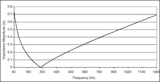 A plot of the impedance as a function of frequency for a single-tuned filter is shown in Fig. 40.14. The filter is based on a 480 V, 300 kvar (three-phase) capacitor bank and is tuned to the 4.7th harmonic with a quality factor, Q, of 150. Note that the quality factor is a measure of the “sharpness” of the tuning and is defined as X/R where X is the inductive reactance for the filter inductor at the (undamped) resonant frequency; typically 50<Q<150 for tuned filters.