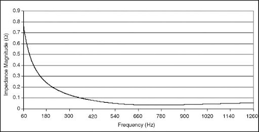 A plot of impedance as a function of frequency for a second-order damped filter is shown in Fig. 40.15. This filter is based on a 480 V, 300 kvar capacitor bank and is tuned to the 12th harmonic. The quality factor is chosen to be 1.5. Note that the quality factor for damped filters is the inverse of the definition for tuned filters; Q=R/X where X is the inductive reactance at the (undamped) resonant frequency. Typically, 0.5<Q<1.5 for damped filters.